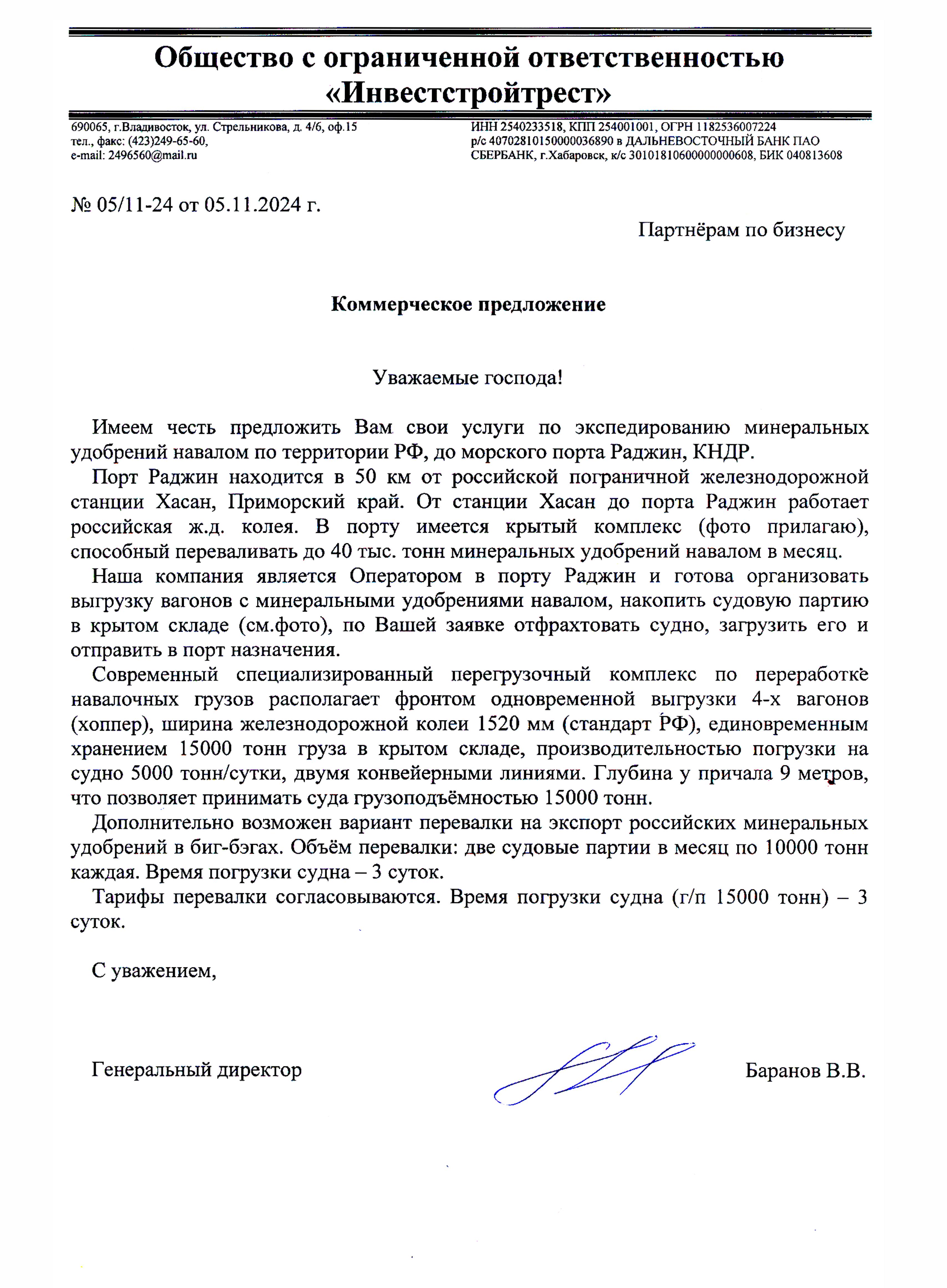 Раскрывая возможности порта Раджин необходимо отметить наличие единственного на Дальнем Востоке специализированного комплекса по перевалке таких сыпучих грузов как минеральные удобрения, либо зерно. Имея тесное сотрудничество с судовладельцами мы окажем оперативное содействие в доставке товара на юг КНР, во Вьетнам, Тайланд и т.д.